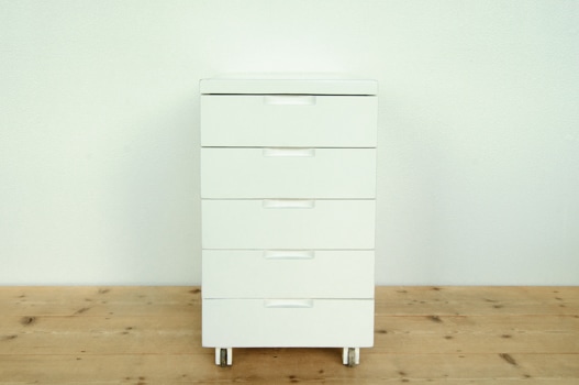 1940年代のアルヴァ・アアルトデザインのデスクボックスが入荷いたしました。今回のデスクボックスはリペイントされているホワイトのタイプになります。キャスターは木で作られたものですので歴史を感じる1台です。欠けなどはみられますが残っていること自体とても貴重だと思います。最近ではなかなか見ることのない珍しいビンテージ品です。とても古い年代のプロダクトになりますので塗装の剥がれや当たり傷などビンテージ感が強めに感じられますが、雰囲気の良さがシンプルな佇まいの中に味わい深さを感じさせてくれます。引き出し内部は当店で殺菌・除菌を施しており清潔な状態を保っております。