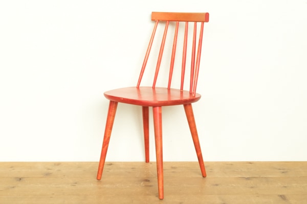 ●レッドにペイントが施されたフィンランドのスポークチェアです。不均一なペイントの表情がビンテージならではの魅力です。どんな人がペイントしたのか、そんなことを想像しながら使う楽しみがある1脚ですね。