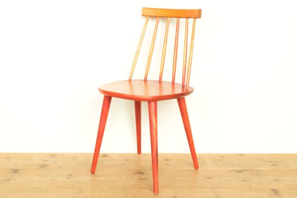 ●レッドにペイントが施されたフィンランドのスポークチェアです。不均一なペイントの表情がビンテージならではの魅力です。どんな人がペイントしたのか、そんなことを想像しながら使う楽しみがある1脚ですね。