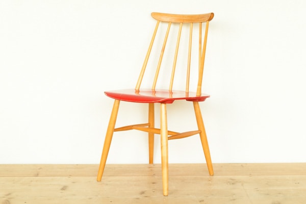 ○コンディションについて○ 1950年代のビンテージ商品です。 当店でも非常に人気の高いイルマリ・タピオヴァーラデザインのファネットチェアが入荷いたしました。フィンランドASKO社製のもので、座面は珍しいレッドのオリジナルペイントとなっております。背もたれはバーチ材を使用しており、スポークが6本のタイプのものです。他の色と揃えたり、お部屋のアクセントにいかがでしょうか。 座面やフレームには使用中にできた擦れ傷や当たりもございますが、ビンテージとして良いコンディションを保っていると思います。リペアスタッフがメンテナンスと組み直しを行っておりますので、安心してお使いいただけます。ファネット特有のゆるみも少なく、実際に座ってみると背中を安定して支えてくれますので快適なすわり心地です。 (180521)