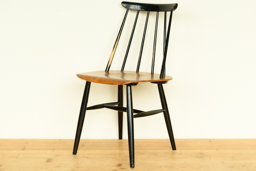 ○コンディションについて○ 1950年代のビンテージ商品です。 当店でも非常に人気の高いイルマリ・タピオヴァーラデザインのファネットチェアが入荷いたしました。フィンランドASKO社製のもので、背もたれのスポークが6本のタイプのものです。こちらは定番カラーの背もたれと脚の部分はブラック、座面はエルム材となっております。長い歴史を経ても尚、色褪せないデザインが魅力です。 フレームや座面には使用中にできた擦れ傷や当たり傷、塗装ムラなどがございますが、年代相応のものだと思います。リペアスタッフがメンテナンスと組み直しを行っておりますので、安心してお使いいただけます。ファネット特有のゆるみも少なく、実際に座ってみると背中を安定して支えてくれますので快適なすわり心地です。 (180531)