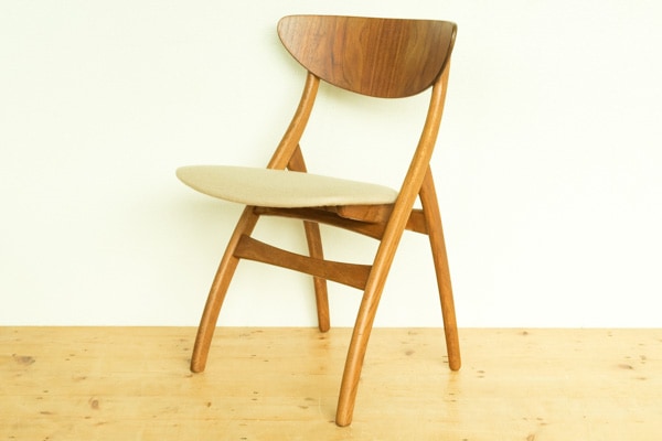 背もたれはチーク材、フレームにはオーク材が使用されています。背もたれから前脚にかけてすっと伸びたレグと、クロスするように美しくアーチがかったラインが印象的なデザインです。
