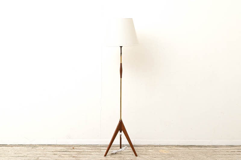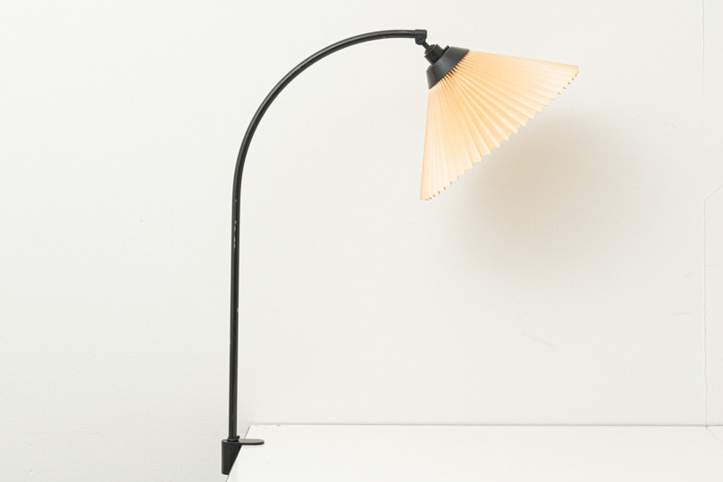 モダニズム期前のデザインと思われる伝統的なスタイルの中に、丁寧な絞りの技術により仕上げられた三次曲面のシェードが印象的なランプです。同時期にフィンランドで照明器具をデザインしたPaavo Tynell(パーヴォ=ティネル)やLisa Johansson-Pape(リサ・ヨハンソン=パッペ)の作品に似た柔らかい印象のシェードですね。