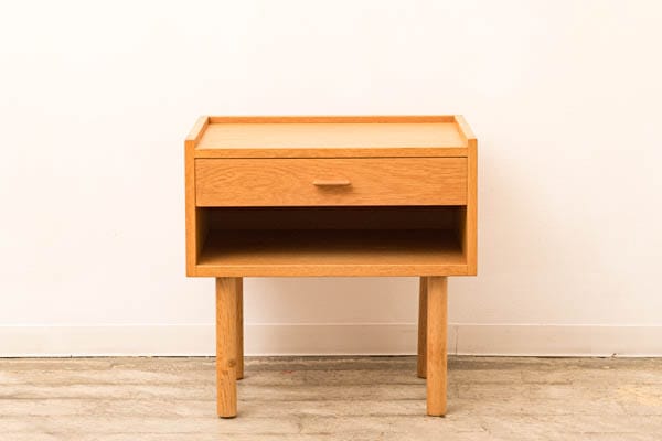 | ※天板には、表面的なすり傷などございますが、大きく目立つようなものではないと思います。 ●こちらは、1960-70年代のビンテージ商品です。 ハンス J.ウェグナーが1966年にデザインし、RY Mobler社でつくられたRY430ナイトテーブルが入荷しました。オーク材は経年により飴色にかわり、ビンテージの良い雰囲気が味わえます。ベッドサイドでテーブルランプや時計などを載せるのによいのはもちろん、背面もオーク材で仕上げられていますので、リビングのソファ脇など、壁から離した場所でもおつかい頂けるアイテムです。 ○コンディションについて○ 天板は表面的なすり傷や小傷などございますが、大きく目立つものではないと思います。収納内部は使用によるシミが確認できますが、クリーニング後に殺菌・除菌を施しました。側面や背面には細かな擦り傷などが確認できますが、年代相応のものだと思います。気になるがたつきなどはございませんので、ご安心ください。 ●デザイナー「Hans J Wegner」 1914年デンマーク、トゥナー生まれ。 1931年に家具職人プロライセンスを取得、この年から1936年まで国立産業研究所に通い 木材について専門的に研究を重ねる。 1936年~38年美術工芸学校に通い家具の設計を専攻する。 1940年より椅子のデザインを始める。 以降現在に至るまで500種類以上の椅子をデザインする。 また、この間に国内外を問わず多くの展示会に出展し賞を受ける。 その作品はニューヨーク近代美術館を始め多くの公共機関にコレクションされている。 1943年~1946年事務所を持ちながらウェグナーの卒業した美術工芸学校教鞭をとる。 (240114)