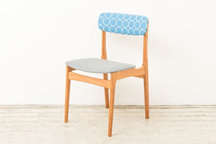 背もたれは大人気ブランド”ミナ・ペルホネン(mina perhonen)”のデザイナーとして良く知られている皆川明氏デザインによる生地、クヴァドラ社「Tambourine Hallingdal 」で張替えいたします。立体感のあるひとつひとつの刺繍の模様が美しい仕上げになっています。清潔感のあるファブリックとビンテージの雰囲気のあるオーク材フレームとのバランスが良く、自信を持っておすすめできる仕上がりです。