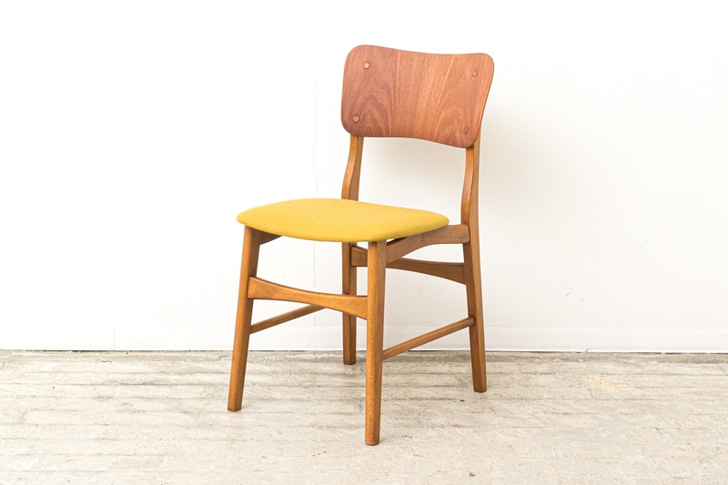 角の取れた四角い背もたれとコンパクトな座面が、かわいらしい印象のダイニングチェアです。背もたれはチーク材、フレームにはビーチ材が使用されています。背もたれが広いため、腰を掛けると背中をしっかりと支えてくれて安定感があり、快適な座り心地です。今回ファブリックはリバコ社よりマスタードカラー(NC-178)を採用しました。座面ファブリックや中材は、ご注文後、当店で新品のものへ交換いたしますので、清潔感のある状態でお使いいただけます。