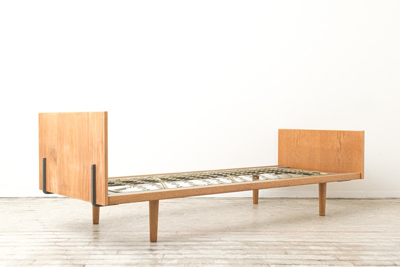 ハンス J.ウェグナーがデザインし、GETAMA社から発表されたシングルベッドが入荷しました。オークを使用したシンプルなフォルムのヘッド・フッドボードの設えにスチール製のスノコが付いたスタイルアップなデザインが特徴の一台です。奥行が86cmほどとなりますので、壁面に寄せてクッションを背もたれ代わりに並べたソファとしてもよさそうです。
