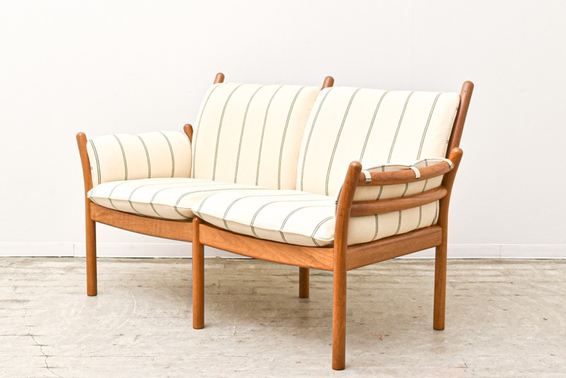 デンマークの建築家であり家具デザイナーのイルム・ヴィケルソーがデザインした、「Genius」2シーターソファが入荷しました。ヴィケルソーがデザインした多くの作品は、美しい湾曲が組み込まれております。こちらのソファもアームや背もたれが外側に広がり、当時の手作業による三次曲面の造形には、さぞかし生産に時間を要しただろうと思われます。