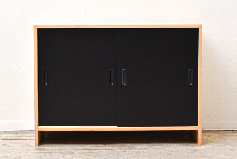 Artek社製、アルヴァ・アアルトデザインのキャビネット217が入荷いたしました。本体はビーチ材、引き戸部分はあまり見られないブラックラッカーでリペイントが施されたツートンカラーをお楽しみいただけます。扉は手掛けが左右両方に設えられており、開けると左右に可動棚が1枚ずつ備えた仕様です。ホワイトの扉とはまた違った締まりのある雰囲気が魅力な1台です。